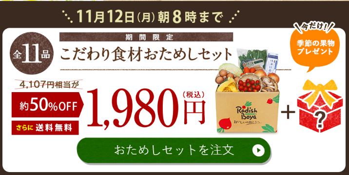 宅配新鮮こだわり食材のらでぃっしゅぼーやの1980円、お試し便をお越しのお客様に購入できるように商品の特徴やこだわりをご紹介させていただくサイトです。ごかぞく様11回限りのお得な半額セットを是非この機会にお試しください♪